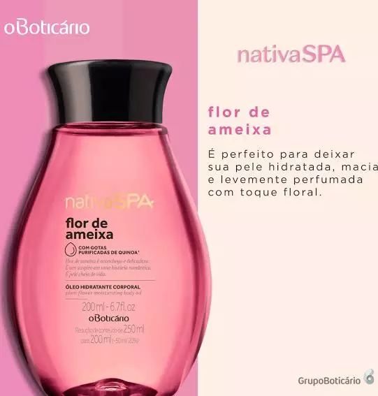 Proporcionandotoque aveludado e ação desodorante,o produto pode ser utilizado como umóleo de banho,promovendo momentos únicos de relaxamento. Para deixar a pele perfumada, oÓleo Desodorante Hidratante Corporal Nativa SPA Flor de Ameixatem uma fragrância equilibrada e sofisticada, tendo como principal o toque floral daFlor de Ameixa.