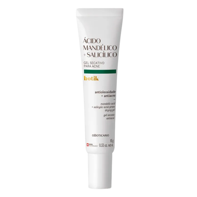OGel Secativo Para Acne Ácido Mandélico + Salicílico Botiké a resposta rápida e eficaz contra espinhas. Criado e testado considerando os tons diversos da pele brasileira, éindicado para a pele oleosa e com tendência à acne.