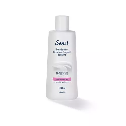 Desodorante Hidratante Corporal de Banho Sensi Hidratação Equilibrada - 250 ml O Desodorante Hidratante Corporal de Banho Jequiti Sensi, possui a tecnologia exclusiva NUTRISENSI, criada para proporcionar hidratação e textura adequadas à necessidade da sua pele. Contém na composição Ceramida e Glicerina. Modo de uso: Após a limpeza da pele no banho, aplique o produto sobre todo o corpo com a pele ainda molhada, aguarde uns segundos e em seguida enxágue suavemente. Segue o corpo normalmente. Exceto rosto.